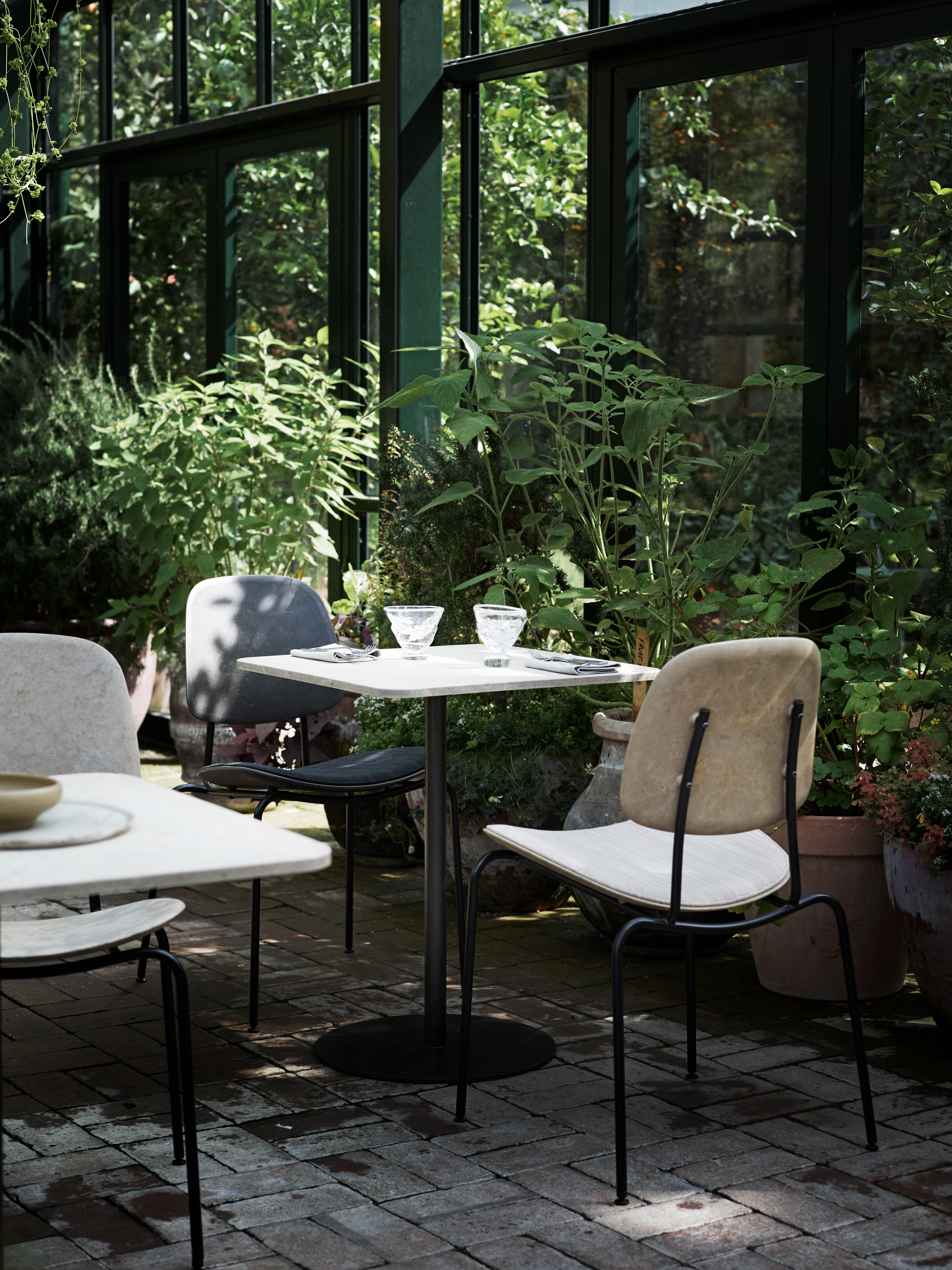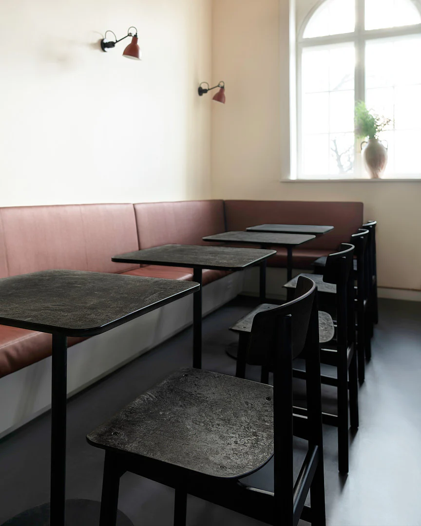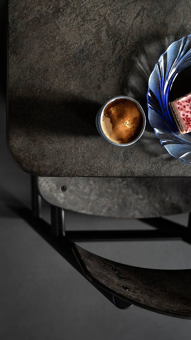 The Mater Café Table features a tabletop made from Matek®, a sustainable material developed using innovative technology that combines recycled fiber-based waste with recycled plastic waste. Its clean, minimalist design makes it a versatile choice for a wide range of settings and the slim cylindrical metal base provides excellent stability while allowing for flexible and comfortable chair placement around the table.
